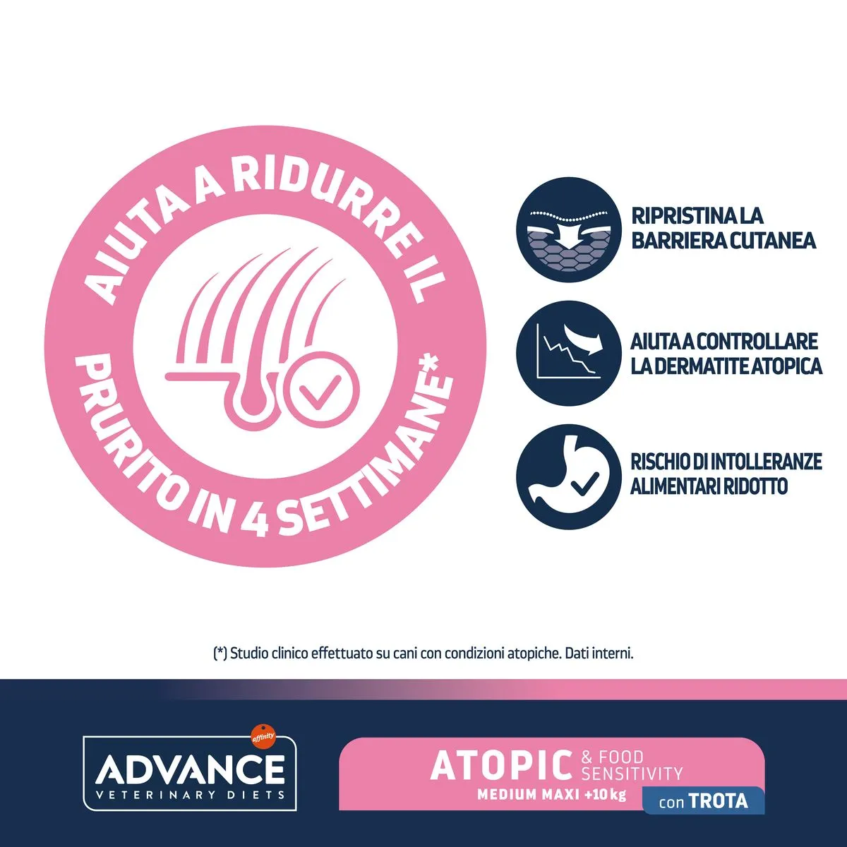 ADVANCE VETERINARY DIETS ATOPIC TROTA MEDIUM/MAXI è un alimento dietetico completo per cani di taglia media/maxi.