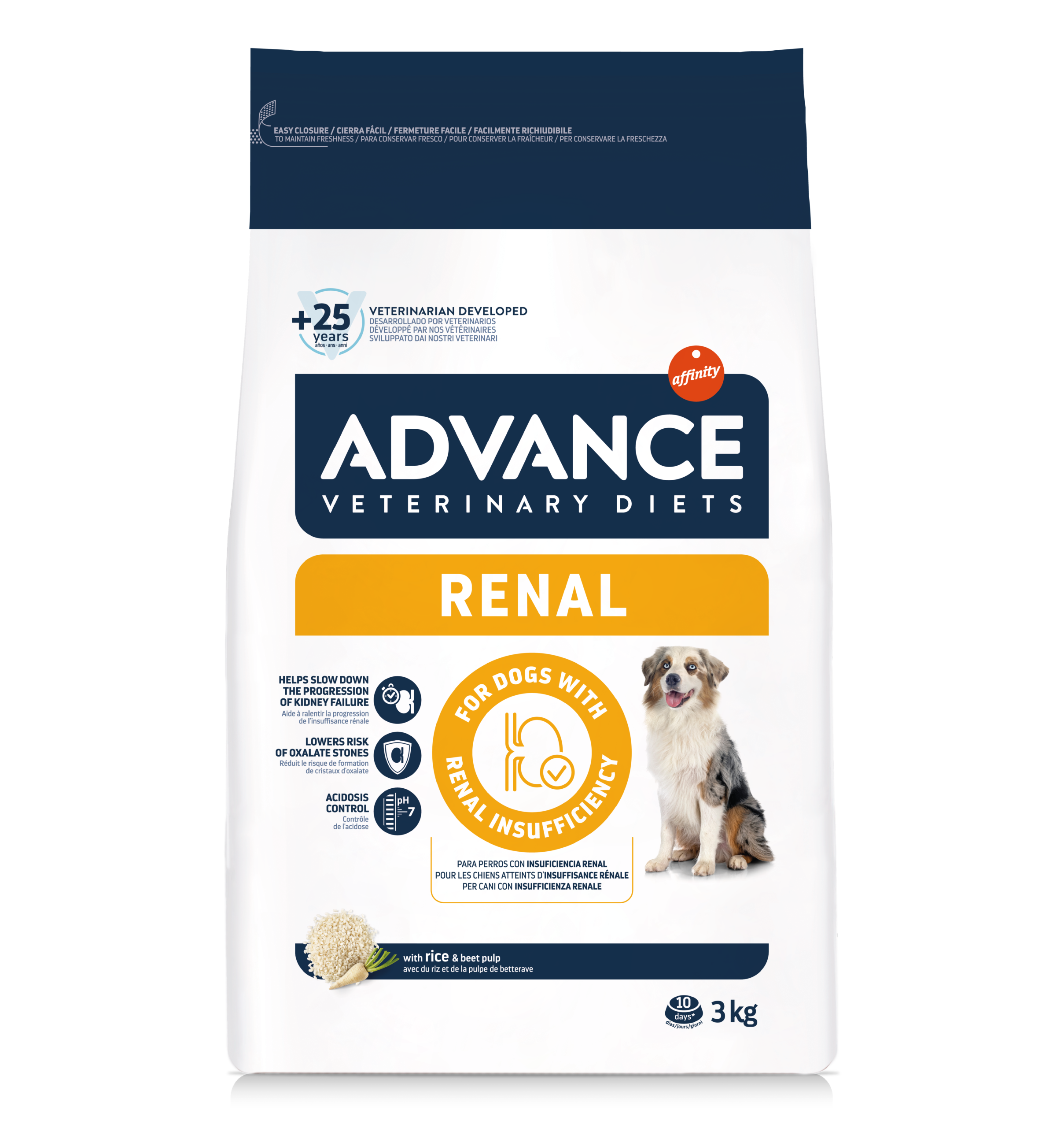 ADVANCE VETERINARY DIETS RENAL è un alimento dietetico completo per cani adulti, con un limitato livello proteine, ma di alta qualità, e un basso contenuto di fosforo, particolarmente indicato per rafforzare il funzionamento dei reni in caso di insufficienza renale cronica.